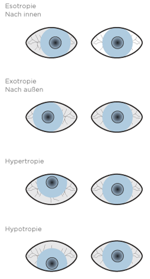Beim Schielen weichen die Augenachsen von der Parallele ab, die Augen sehen in verschiedene Richtungen.