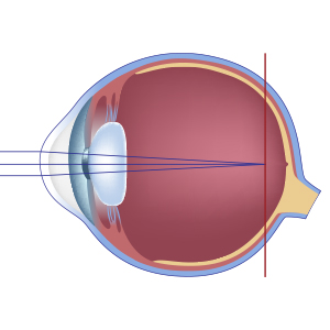 Debido a que el globo ocular es más largo que lo normal, los rayos lumínicos forman la imagen delante de la retina, provocando así una visión borrosa de los objetos lejanos y una nítida de los cercanos.